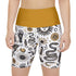 Mystic Miss workout shorts are a cosmic collage of celestial symbols and ancient wisdom—designed for movement, meditation, or pure moonlit mischief. With a golden high waistband and an all-over print of serpents, suns, lotus blooms, and all-seeing eyes, these shorts are more than activewear—they’re armor for the soul. Every element is drawn with intention: from sacred geometry to botanical sigils, the pattern channels mysticism with bold, witchy elegance.